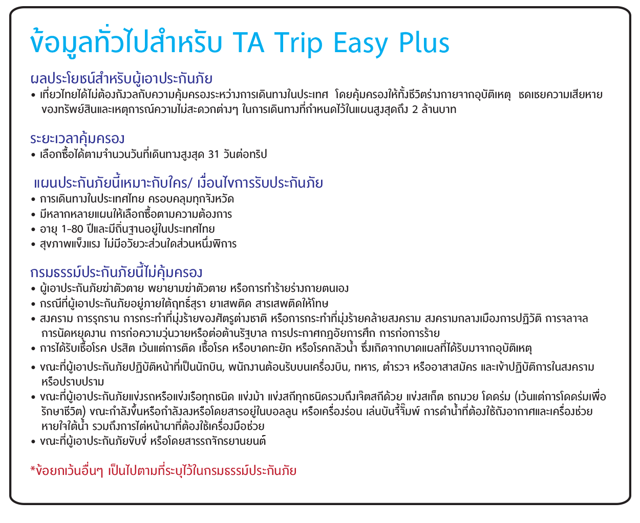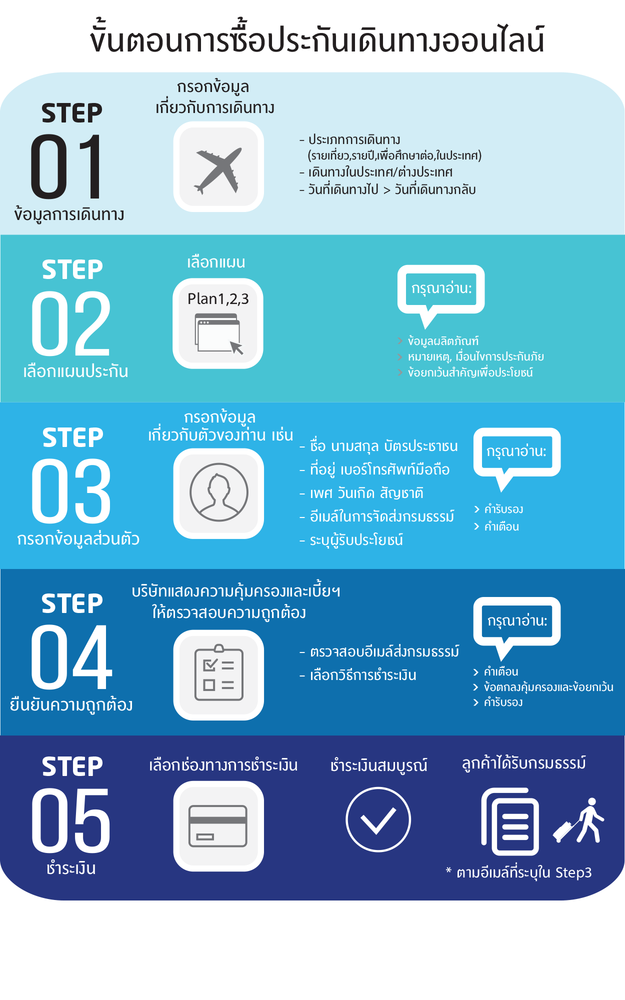 กรุณาซื้อกรมธรรม์ก่อนการเดินทางออกจากประเทศไทยล่วงหน้าอย่างน้อย 2 ชั่วโมง และเลือกวันที่เดินทางให้ครอบคลุมตั้งแต่ออกจากประเทศไทยจนกลับถึงประเทศไทย